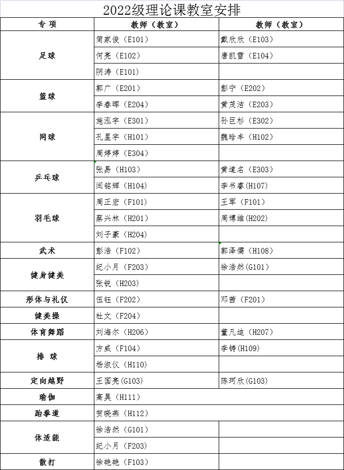 各学院: 经教务处同意,本学期2022级本科生第1周体育课为必一(中国)官方理论课,9月18日起恢复户外教学。根据教室资源状况,现将理论课具体安排通知如下: