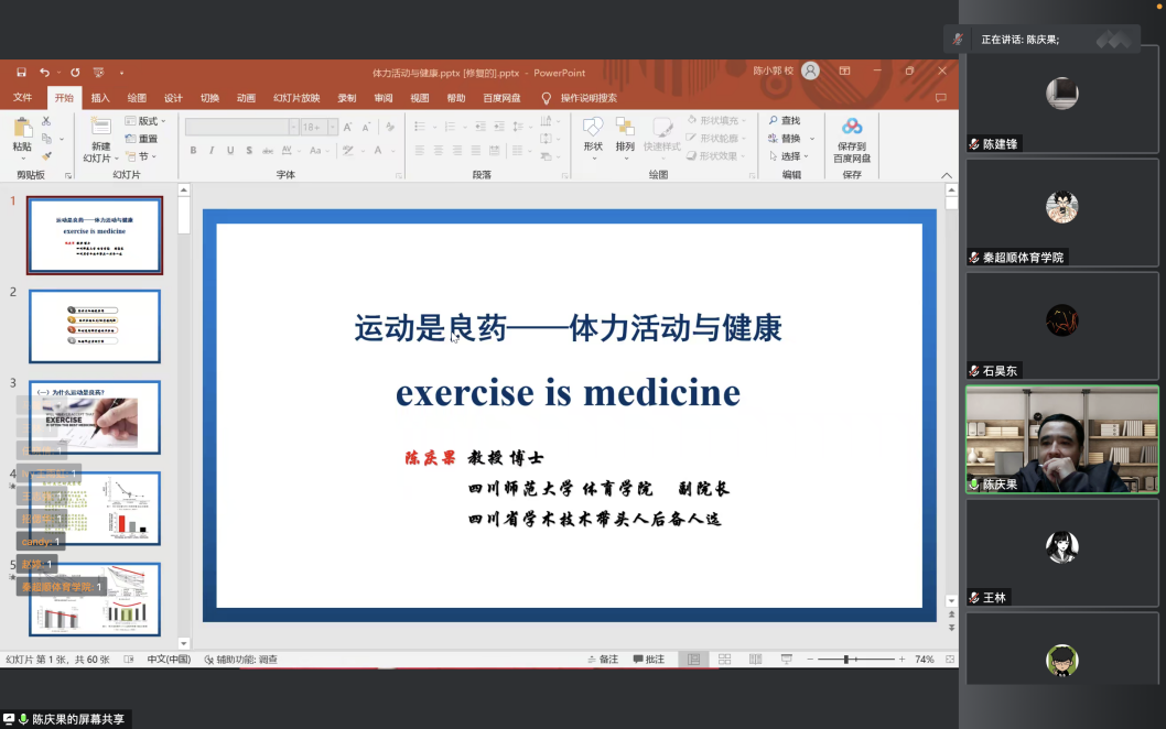 2022年11月10日,四川师范大学必一手机客户端副院长陈庆果教授在线上举办了题为《再谈运动与健康:运动是良医》的光华讲坛,必一手机客户端副院长陈丛刊主持本次讲座,必一手机客户端研究生、部分教师以及校内外师生等共计60余人参加了此次讲座。